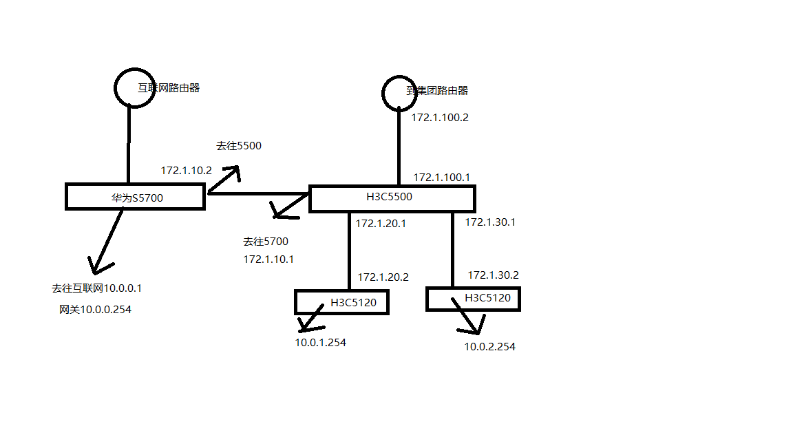 总结:互联网路由器需要配置上nat转发和回程路由,你的网络规划似乎不太优化,右边,5120和5500之间为什么要跑三层 ?必须的吗?如果不是必须的,最好别跑三层,走trunk链路