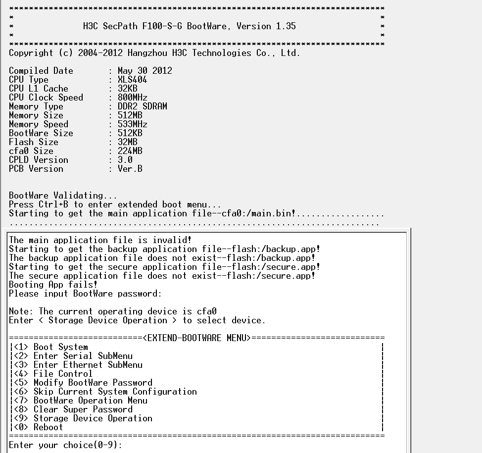 #在设备启动过程中,当出现“Press Ctrl+B to enter extended boot menu...”时,立即键入<Ctrl+B>,按下<Enter>键后,系统将进入BootWare主菜单。
