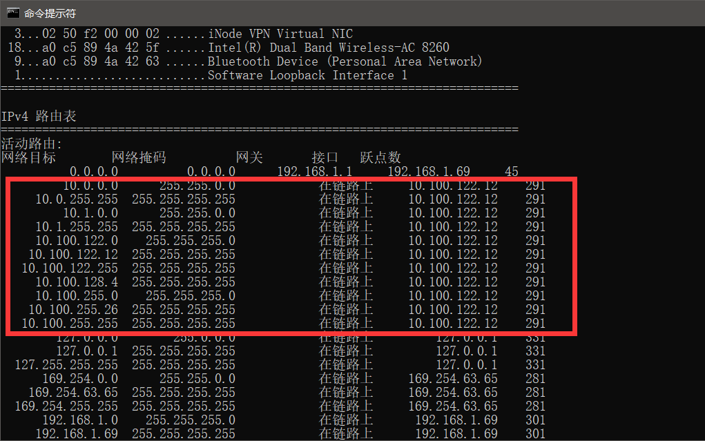 网络目标 网络掩码 网关 接口 跃点数 0.0.0.0 0.0.0.0 192.168.1.1 192.168.1.69 45 10.0.0.0 255.255.0.0 在链路上 10.100.122.12 291 10.0.255.255 255.255.255.255 在链路上 10.100.122.12 291 10.1.0.0 255.255.0.0 在链路上 10.100.122.12 291 10.1.255.255 255.255.255.255 在链路上 10.100.122.12 291 10.100.122.0 255.255.255.0 在链路上 10.100.122.12 291 10.100.122.12 255.255.255.255 在链路上 10.100.122.12 291 10.100.122.255 255.255.255.255 在链路上 10.100.122.12 291 10.100.128.4 255.255.255.255 在链路上 10.100.122.12 291 10.100.255.0 255.255.255.0 在链路上 10.100.122.12 291 10.100.255.26 255.255.255.255 在链路上 10.100.122.12 291 10.100.255.255 255.255.255.255 在链路上 10.100.122.12 291 127.0.0.0 255.0.0.0 在链路上 127.0.0.1 331 127.0.0.1 255.255.255.255 在链路上 127.0.0.1 331 127.255.255.255 255.255.255.255 在链路上 127.0.0.1 331