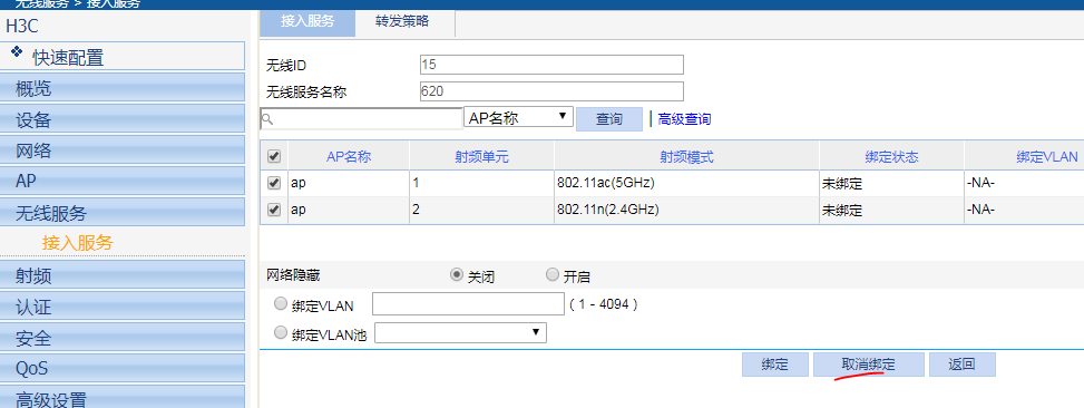 在无线服务-接入服务中先关闭这个wifi,然后在WIFI信号的最右边有个锁链的图标,点击进去后取消绑定即可