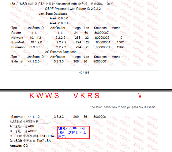 刚才我没看到router id2.2.2.2,我理解的是图中该条lsa的含义就是说,abr是为2.2.2.2,引入外部路由的asbr为3.3.3.3,如果该路由器router id就是2.2.2.2的话,那么就是abr,这个题的答案是不是有问题
