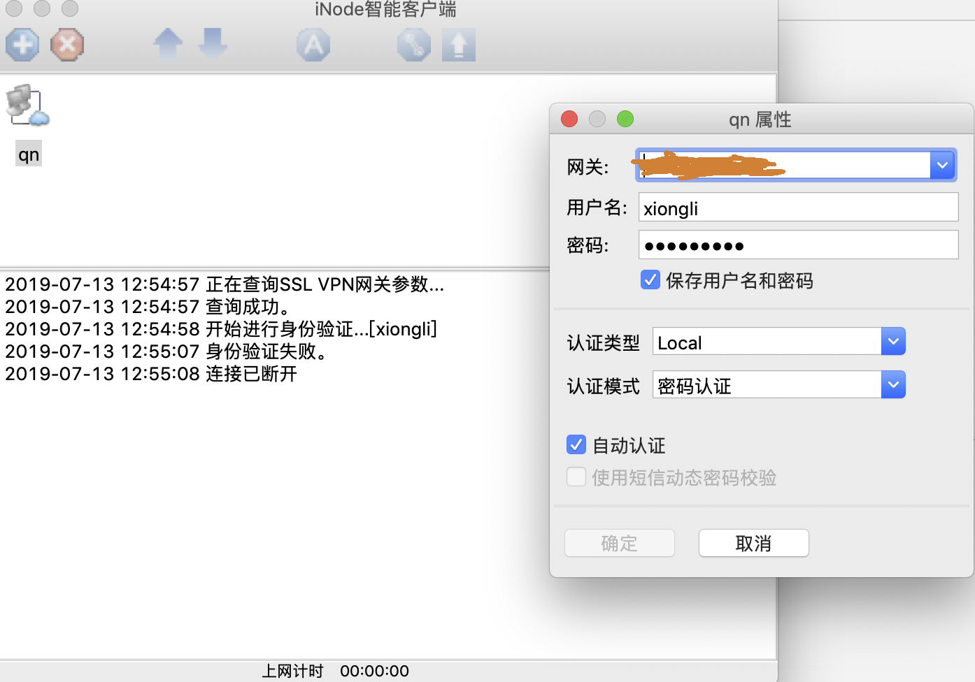 我安装了inode 7.3 E0536 for mac版本智能客户端,mac os版本是10.14.5,使用SSL VPN方式登录设备,始终显示认证失败,同样版本的windows客户端,参数账号密码都一样,就可以顺利登录,请问这是版本兼容问题么?