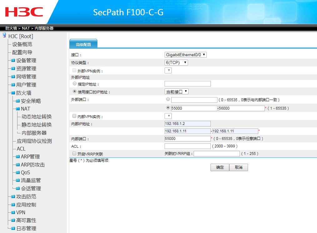 如题,我在防火墙->NAT->内部服务器中想添加 55000-56000范围的端口,总是提示外部端口和内部端口不一致,可是内部端口又只让填写一个固定的端口,这是什么设置啊? 内部端口也要使用 55000-56000的