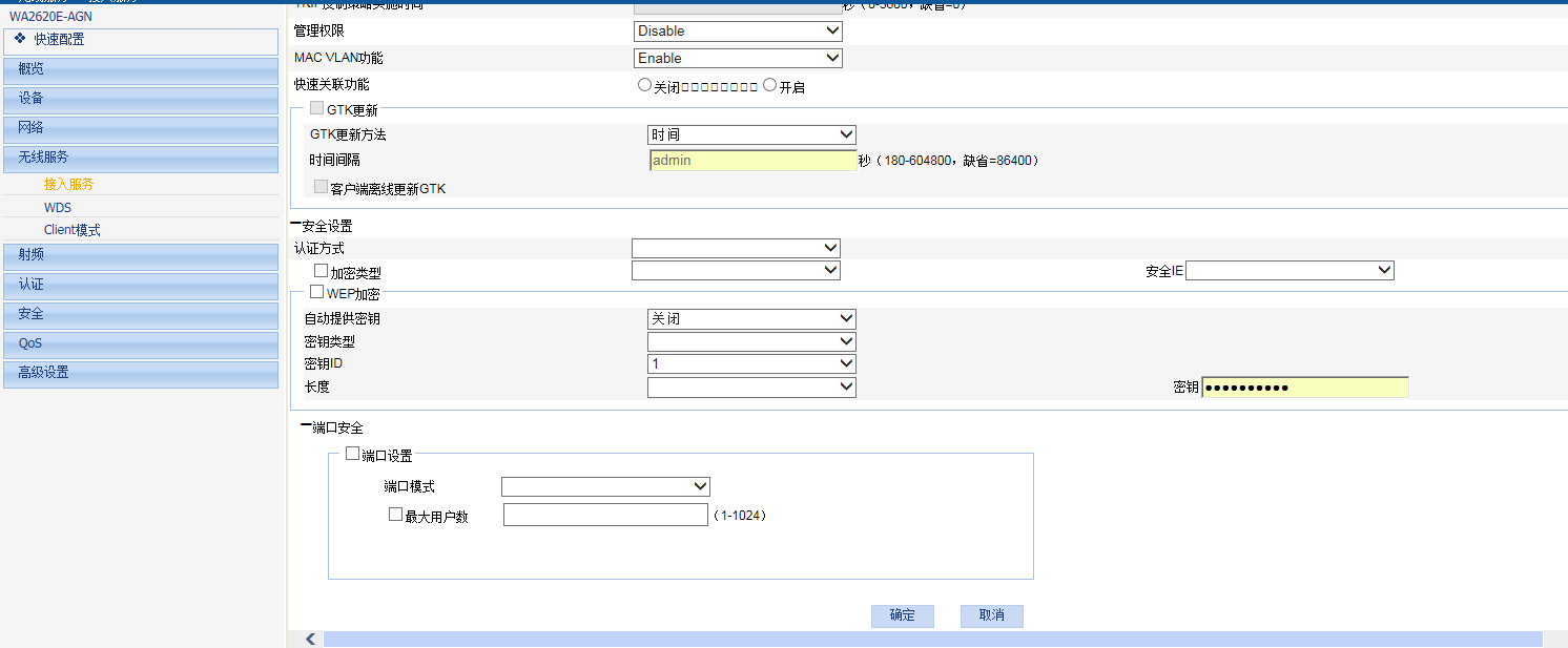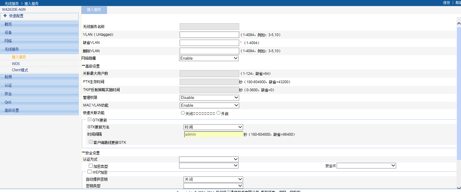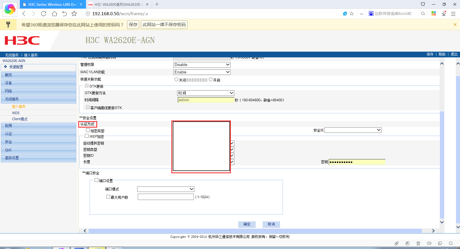 认证方式下拉是空白的啊,没东西给我选,我对比过AC了,因为保存不了(需设置VLAN信息)所以k客户端都拿不到IP