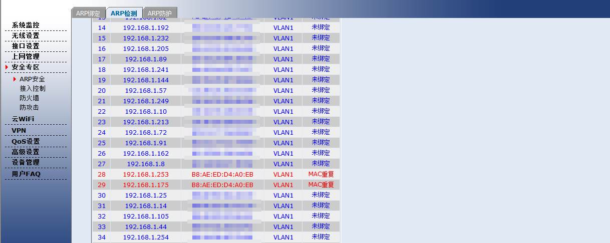路由器里面有两个MAC地址是一样的,但ip地址不一样,状态显示为绑定,使用IE浏览器进行删除两个地址或者其中一个,但刷新后还是会出现两个一样的MAC地址,换ip地址同样出现。Microsoft网络客户端----网络地址----设置为不存在,还是一样。(PS:ARP绑定也不行)