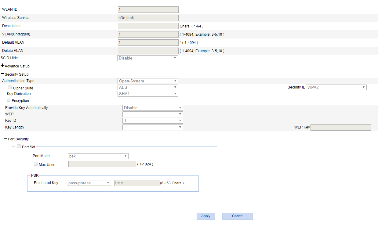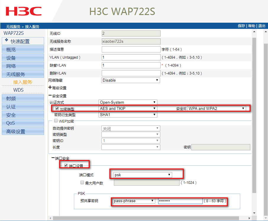 AP类型:H3C WA4320-ACN-C ,配置无密钥访问,或者WEP可正常连接,使用WPA2-PSK[AES]加密方式,链接提示密码错误,苹果安卓手机都一样,不知道到底是什么问题?ap配置截图如下: