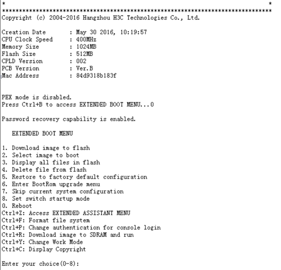 #断电重启交换机,当出现Press Ctrl-B to enter Extended Boot menu...3时,迅速按Ctrl+B(也可以开机启动的时候一直按着ctrl+B),进入bootware菜单后,提示输入密码。密码默认为空,直接回车即可,然后显示如下界面: