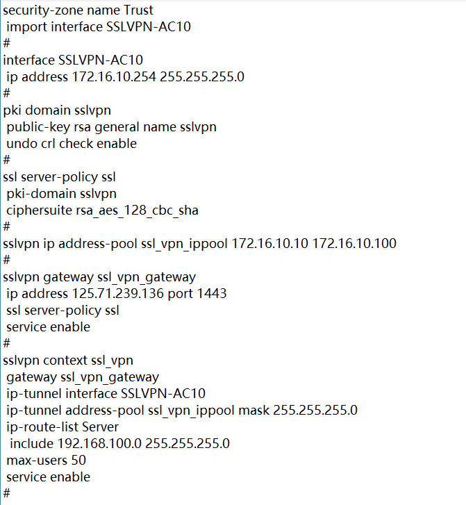 没有配置资源 # 配置SSL VPN访问实例ctx引用SSL VPN AC接口1 [Device-sslvpn-context-ctx] ip-tunnel interface sslvpn-ac 1 # 配置SSL VPN访问实例ctx引用地址池ippool。 [Device-sslvpn-context-ctx] ip-tunnel address-pool ippool mask 255.255.255.0 # 创建SSL VPN策略组pgroup,引用路由列表rtlist,并同时配置对IP接入进行URI ACL过滤。 [Device-sslvpn-context-ctx] policy-group pgroup [Device-sslvpn-context-ctx-policy-group-pgroup] ip-tunnel access-route ip-route-list rtlist [Device-sslvpn-context-ctx-policy-group-pgroup] filter ip-tunnel uri-acl uriacl [Device-sslvpn-context-ctx-policy-group-pgroup] quit # 开启SSL VPN访问实例ctx。 [Device-sslvpn-context-ctx] service enable [Device-sslvpn-context-ctx] quit