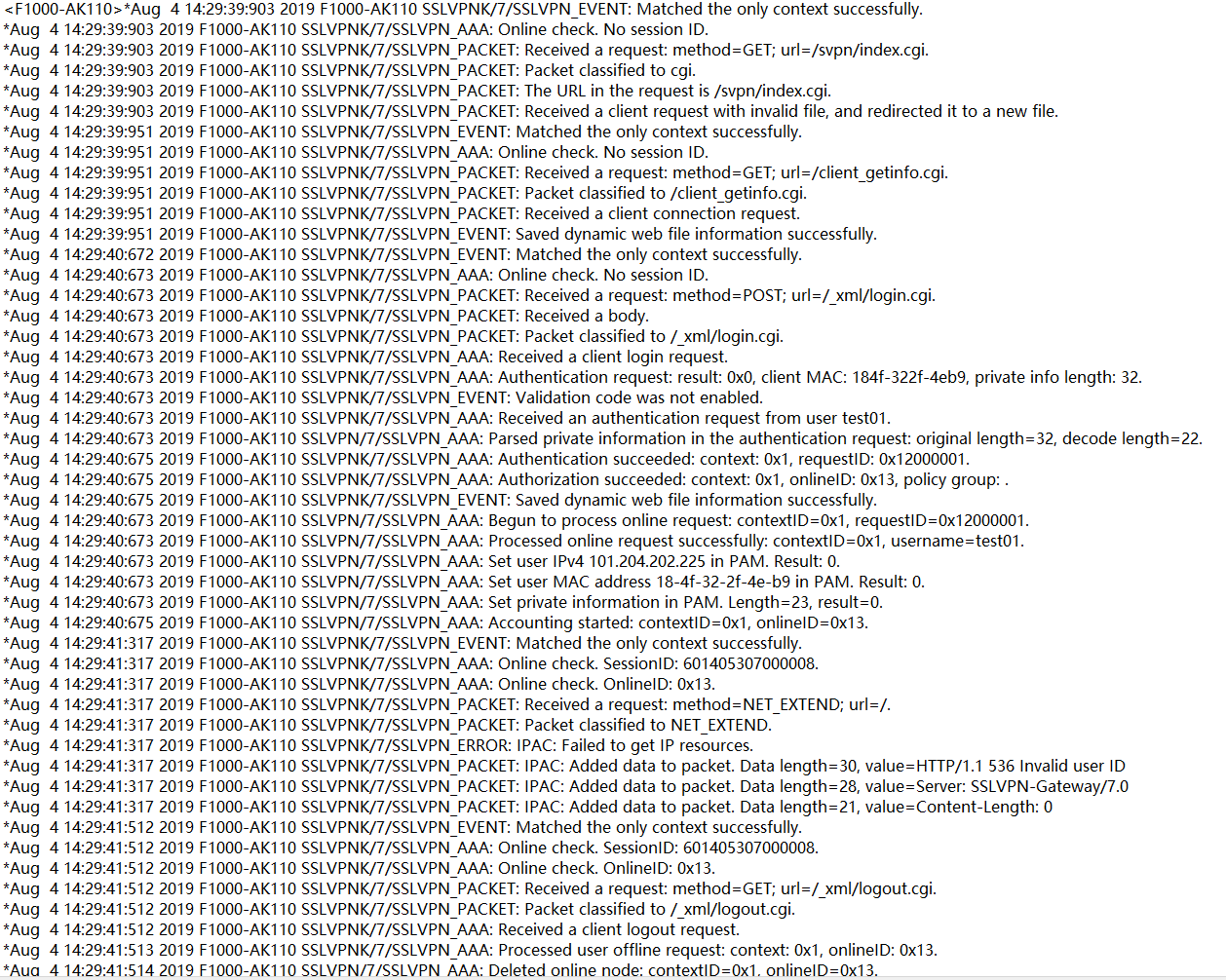 防火墙错误提示:*Aug 4 14:40:01:541 2019 F1000-AK110 SSLVPNK/7/SSLVPN_ERROR: IPAC: Failed to get IP resources.