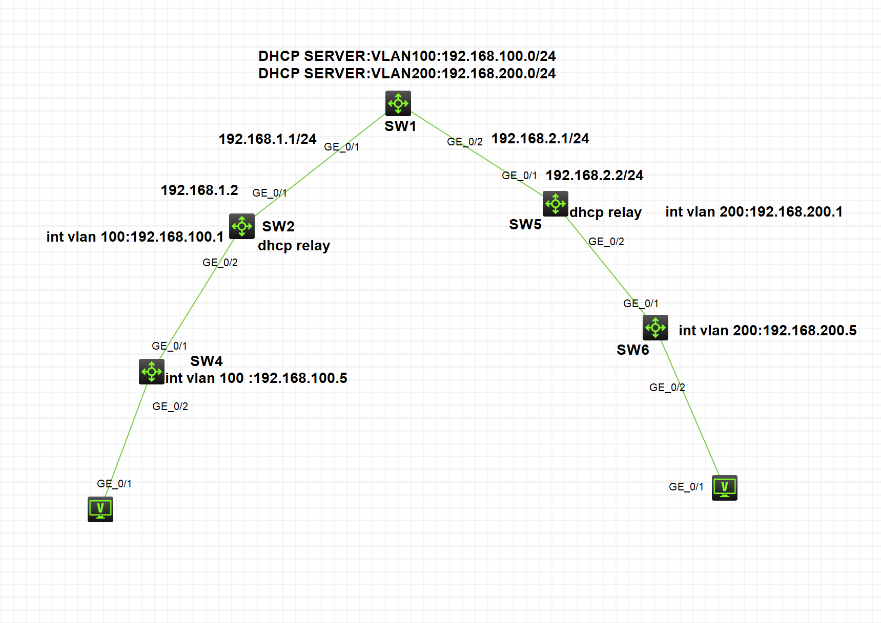 SW2 和SW4互联端口为TRUNK模式 SW5和SW6互联端口为TRUNK模式。