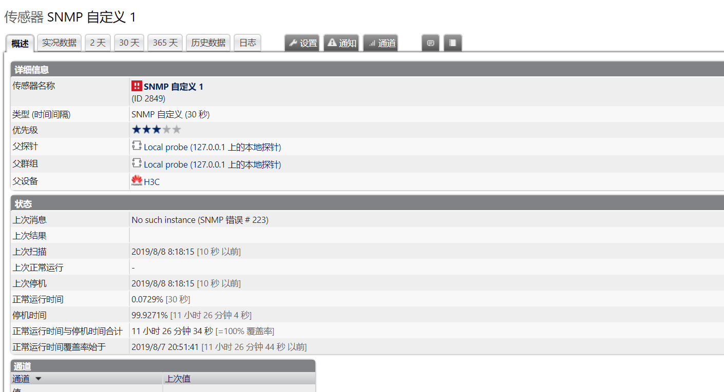 使用PRTG监控此台设备,根据配置SNMP协议设定,端口信息等都能监控,唯一此设备CPU使用率等无法监控,报错提示