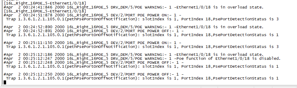 Port power enabled :enable Port power ON/OFF :on Port power status :Standard PD was detected Port power mode :signal Port PD class :0 port power priority :low Port max power :15400 mW Port current power :2400 mW Port peak power :4100 mW Port average power :2281 mW Port current :50 mA Port voltage :49 V