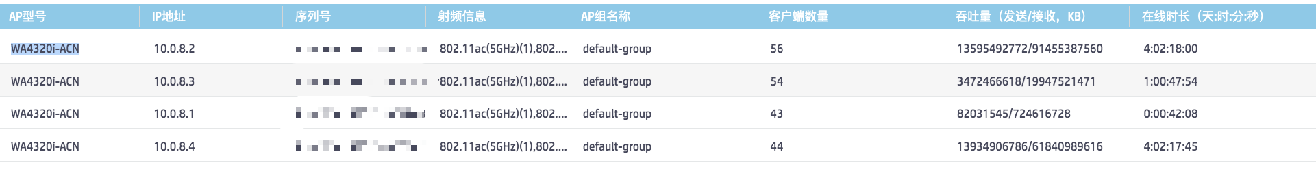 如下所示,中间2个AP(IP是:10.0.8.1,10.0.8.3)经常掉线.