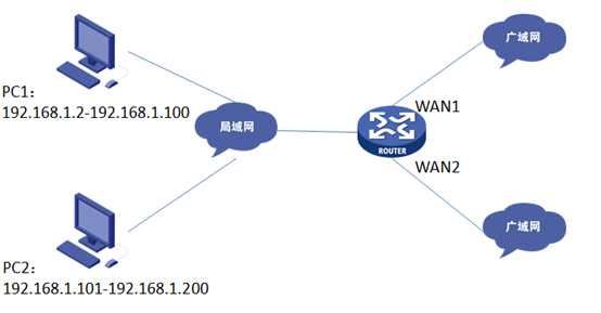 路由器的WAN1WAN2口分别接运营商线路上网,企业内网分为普通用户区(IP 地址范围是192.168.1.2192.168.1.100)和管理层用户区(IP 地址范围是192.168.1.101192.168.1.200)。要求通过设置策略路由,实现管理层用户区通过WAN1口上网,普通用户区通过WAN2口上网的需求。