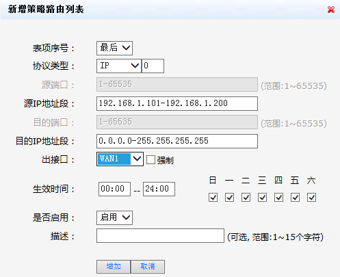 配置管理层用户区网段通过WAN1口上网的策略路由:选择协议类型为ip,源IP地址段设置为“192.168.1.101192.168.1.200”,目的地址设置为“0.0.0.0-255.255.255.255”,出接口选择“WAN1”,是否启用选择“启用”,生效时间可以根据现场的情况进行选择配置,配置好后点击【增加】