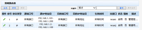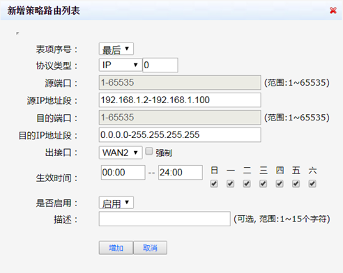 同理,再配置普通用户区网段通过WAN2口上网的策略路由:选择协议类型为“ip”,源IP地址段设置为“192.168.1.2192.168.1.100”,目的IP地址设置为“0.0.0.0-255.255.255.255”,出接口选择“WAN2”是否启用选择“启用”,生效时间可以根据现场的情况进行选择配置,配置好后点击【增加】