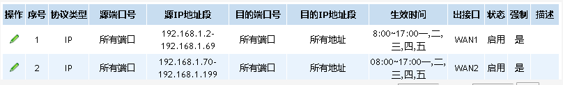 ![]() | 2 | IP | 所有端口 | 192.168.1.70-192.168.1.199 | 所有端口 | 所有地址 | 08:00~17:00一,二,三,四,五 | WAN2 | 启用 | 是 |