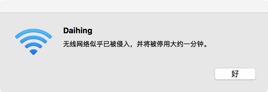 连的公司wifi,过几秒钟就会提示无线网络似乎已被侵入,并将被停用大约一分钟,然后就没网了,请问该怎么处理?电脑是苹果的,有大佬指点下吗
