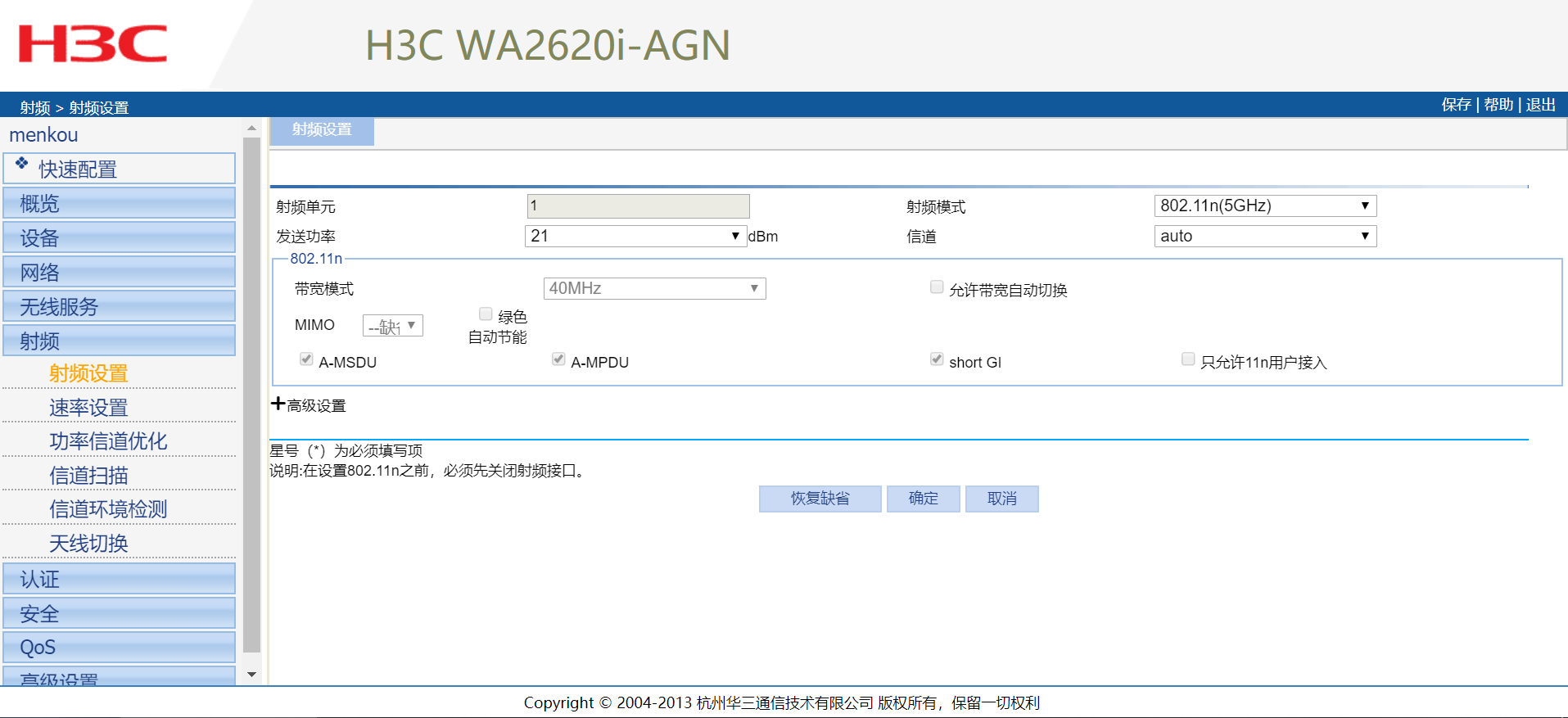 华三AP设置了5G频段最大功率21db,但是最终显示的功率很小,只有3db,是否可以强制设置最大功率不变化,在命令行里面该如何设置?