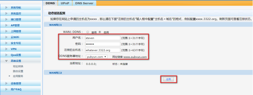 #在导航栏中选择“高级配置 >应用服务 > DDNS”,在动态域名配置页面进行如下配置:WAN 1 DDNS状态设置为“启用”状态,用户名密码设置为登录DDNS服务器的用户名和密码(账户名为steven、密码为nevets),注册的主机名设置为申请到的域名“***.***,DDNS服务器地址设置为“pubyun.com”。然后单击<应用>。