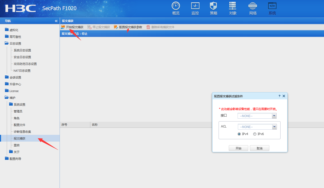 选择acl或者接口后,(比如选择1/0/1口),点击开始,设备就开始捕获经过该接口的报文,就在这个页面就能看到,想要停止的时候点击停止,报文在下面列表里,可以点击下载。