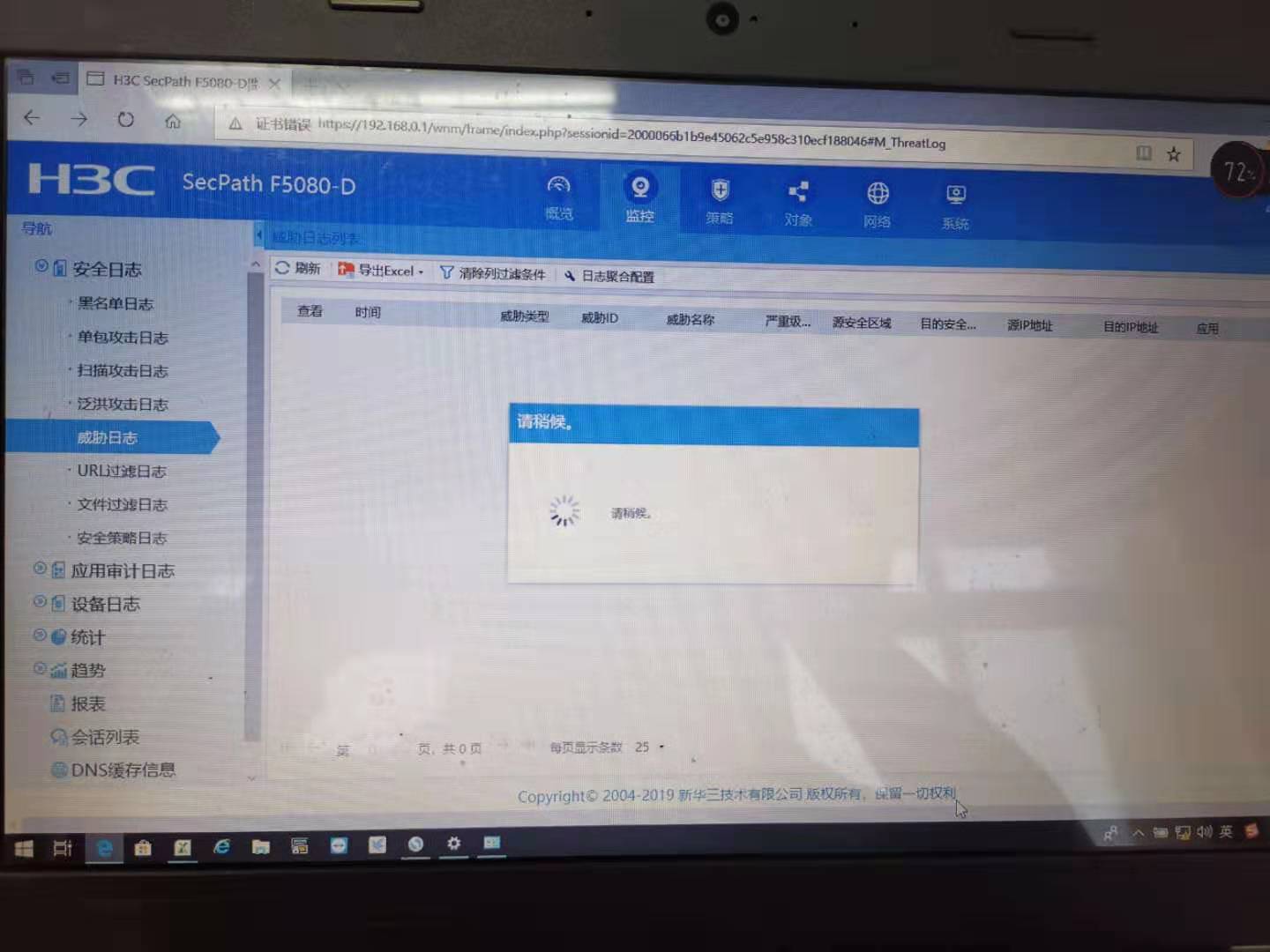 如图 ,设备已经开启 session statistics enable 但威胁日志下面的几个项都不能刷出来,设备只是测试没有接任何业务,只在管理口接了我的电脑