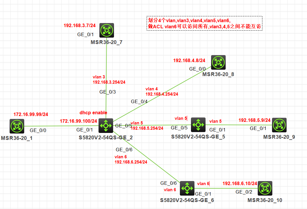 想用ACL 实现局域网内 6段可以访问全网, 3,4,5网段之间不能互访, 请求大神给个思路, 能贴出配置命令最好(就acl那几条就行 谢谢啊)