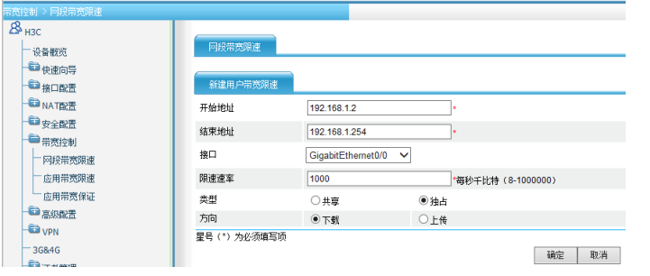 #进入新建网段带宽限速的配置页面。设置被限速的IP地址范围为192.168.1.2---192.168.1.254,每IP下行方向限速1000kbps,应用在公网接口G0/0,类型选择“独占”,方向选择“下载”,完成配置后点击“确定”按钮