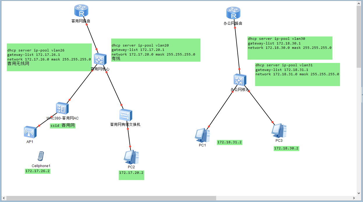 看你画的拓扑办公网和客用网是两个独立的系统,这种场景如果不做物理上的改动那在客用网上是无法获取到办公网分配的地址的。一定要做的话现场条件允许客用网核心和办公网核心互联吗?
