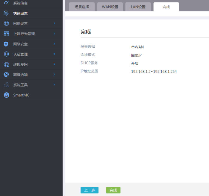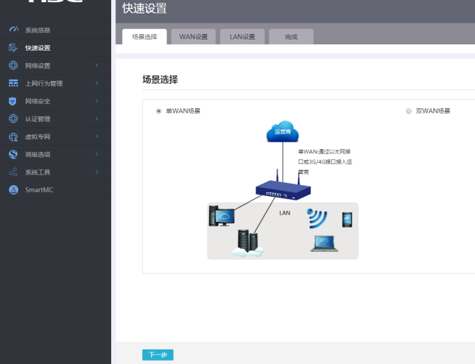 # 登陆WEB管理页面(默认情况下,登陆地址为192.168.0.1/23,登陆用户名为admin,登陆密码为admin),在导航栏选择“快速设置”,进入“场景选择”页面,选择“单WAN场景”, 点击“下一步”按钮。