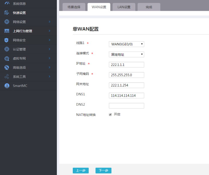 #WAN设置中线路1选择“WAN0(GE0/0)”,连接模式选择“固定地址”按实际需求设置IP地址,网关地址,DNS地址,NAT地址转换保持默认的“开启“状态。然后点击“下一步”按钮