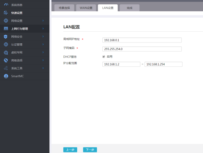 #进入“LAN设置”根据实际需求设置内网网段和DHCP地址分配范围,然后点击“下一步”按钮