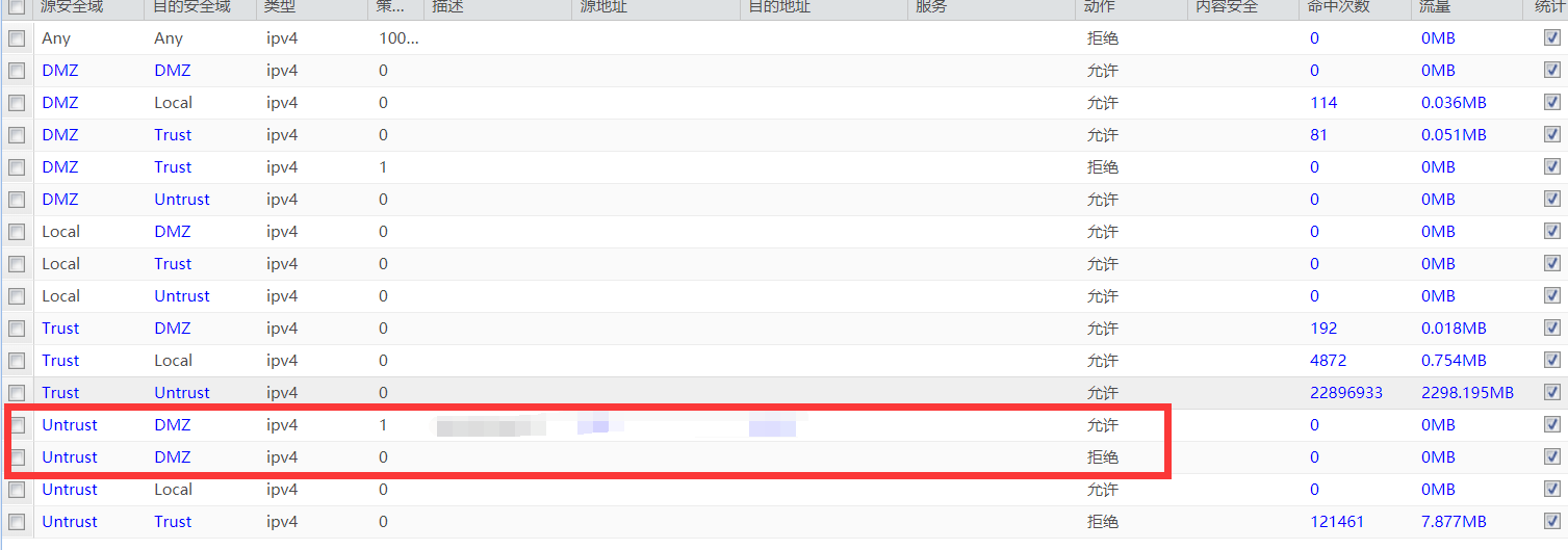 NAT实在边界路由器做的,这台防火墙在路由器下边。也没有冲突的策略,很奇怪。