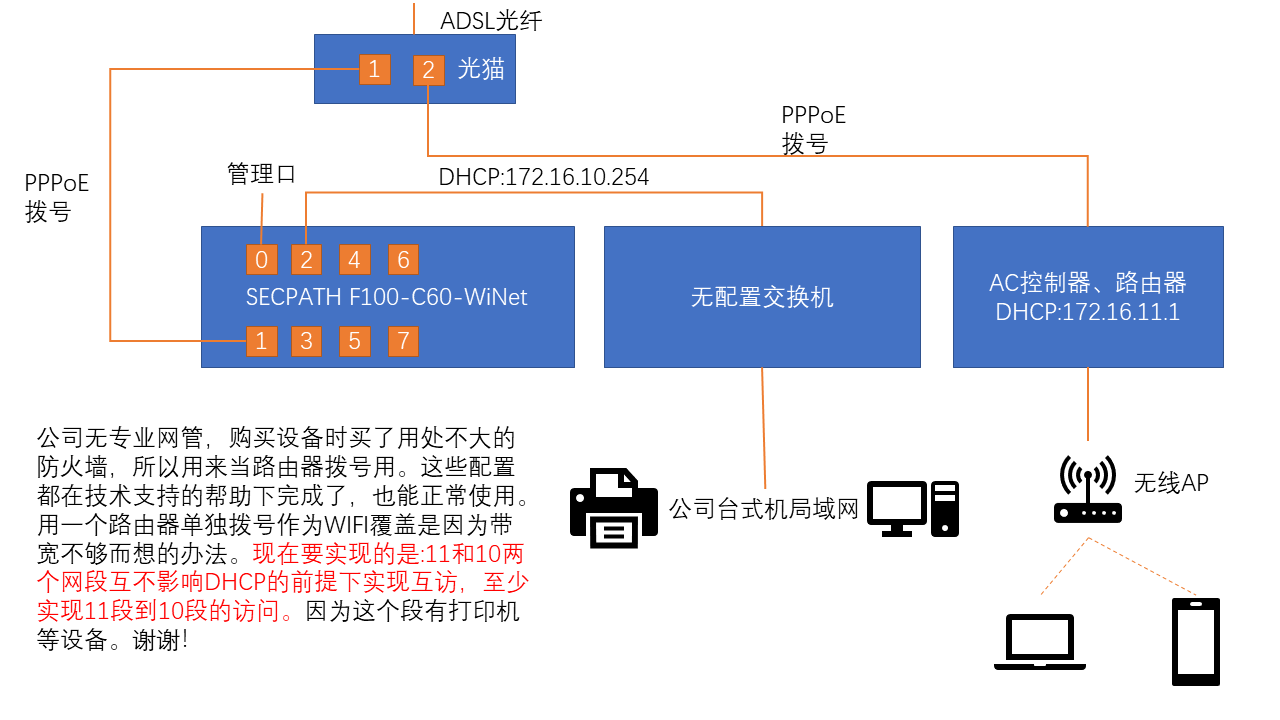 公司无专业网管,购买设备时买了用处不大的防火墙,所以用来当路由器拨号用。这些配置都在技术支持的帮助下完成了,也能正常使用。用一个路由器单独拨号作为WIFI覆盖是因为带宽不够而想的办法。现在要实现的是:11和10两个网段互不影响DHCP的前提下实现互访,至少实现11段到10段的访问。因为这个段有打印机等设备。谢谢!