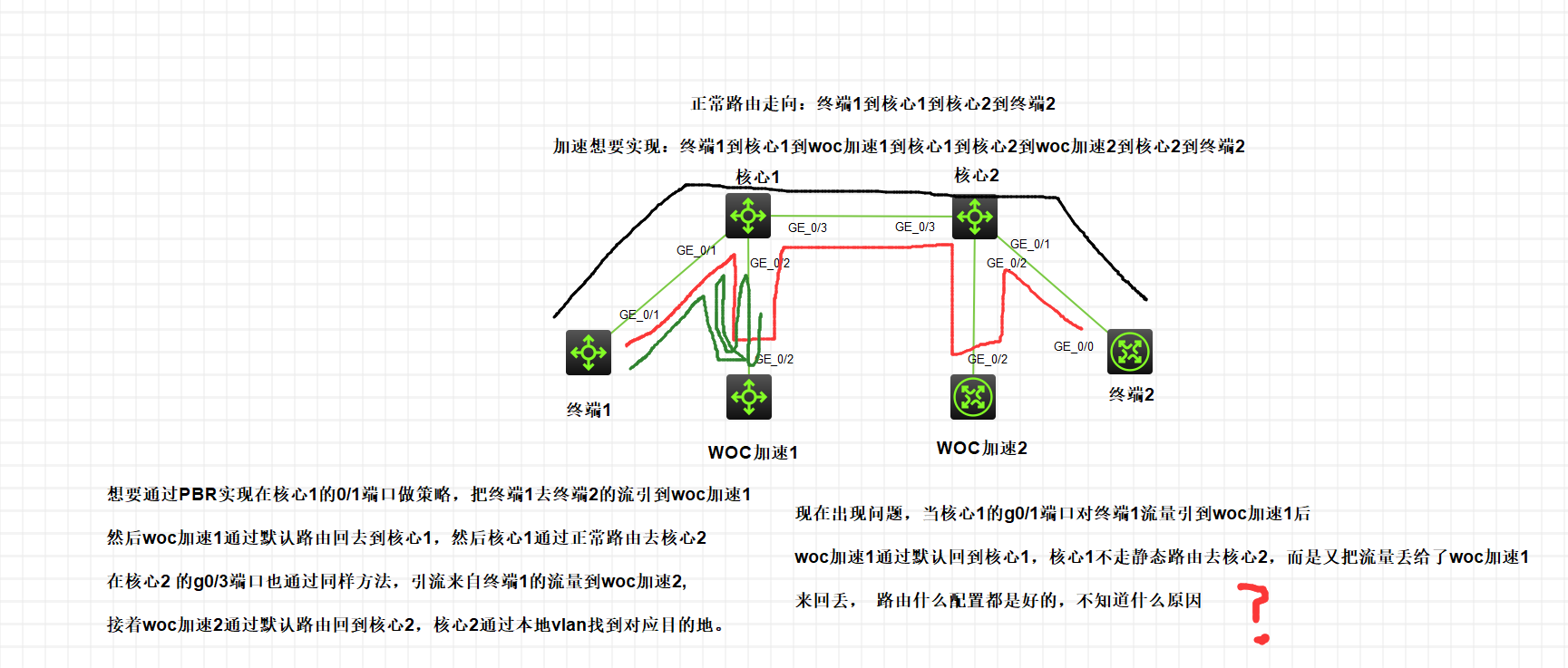 黑色为正常路由走向 红色为想要做完pbr策略的效果走向 绿色为做完后的实际走向 不知道什么原因 求解 是不是和核心1的快速转发表有关,源地址为核心1的流再经过核心1就不差表,直接转发给woc1了???