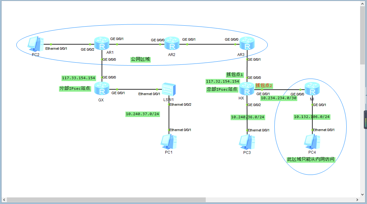 如下图拓扑,在总部PC1和分部PC3都可以访问公网的PC2,总部的PC4只可以通过内网访问。现需要使用IPsec建立隧道使得分部的PC1可以访问总部的PC4。隧道建立后使用分部的PC1ping总部PC4,分别从总部IPsec站点两端进行抓包,从抓包点1发现了ESP协议的数据包,说明隧道建立成功,从抓包点2发现PC4在回包时将TTL值耗尽,导致PC1无法ping通PC4。分部网段为10.240.37.0/24,由于总部处有多个需要访问的服务器,且都属于10网段,所以建立隧道时我抓取的流量为10.240.37.0和10.0.0.0。