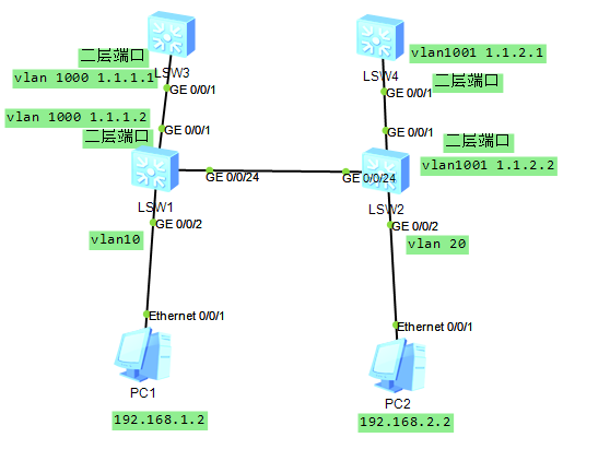 LSW1和2互联是trunk口还是access口都可以的,只要两边互联地址互ping能通。
