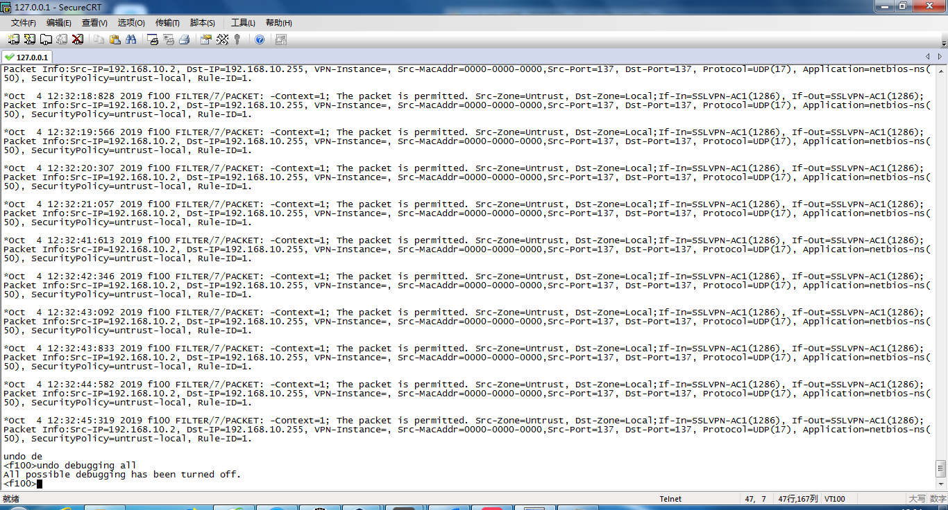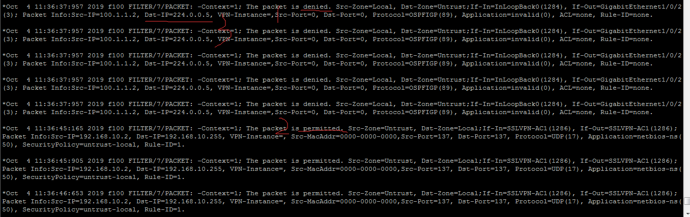 *Oct 4 11:53:30:432 2019 f100 FILTER/7/PACKET: -COntext=1; The packet is permitted. Src-ZOne=Untrust, Dst-ZOne=Local;If-In=SSLVPN-AC1(1286), If-Out=SSLVPN-AC1(1286); Packet Info:Src-IP=192.168.10.2, Dst-IP=192.168.10.255, VPN-Instance=, Src-MacAddr=0000-0000-0000,Src-Port=137, Dst-Port=137, Protocol=UDP(17), Application=netbios-ns(50), SecurityPolicy=untrust-local, Rule-ID=1. 大佬,这个10网段是我设置的VPN连接成功后获取的IP网段,这里怎么会是untrust到local而不是trust区域呢?