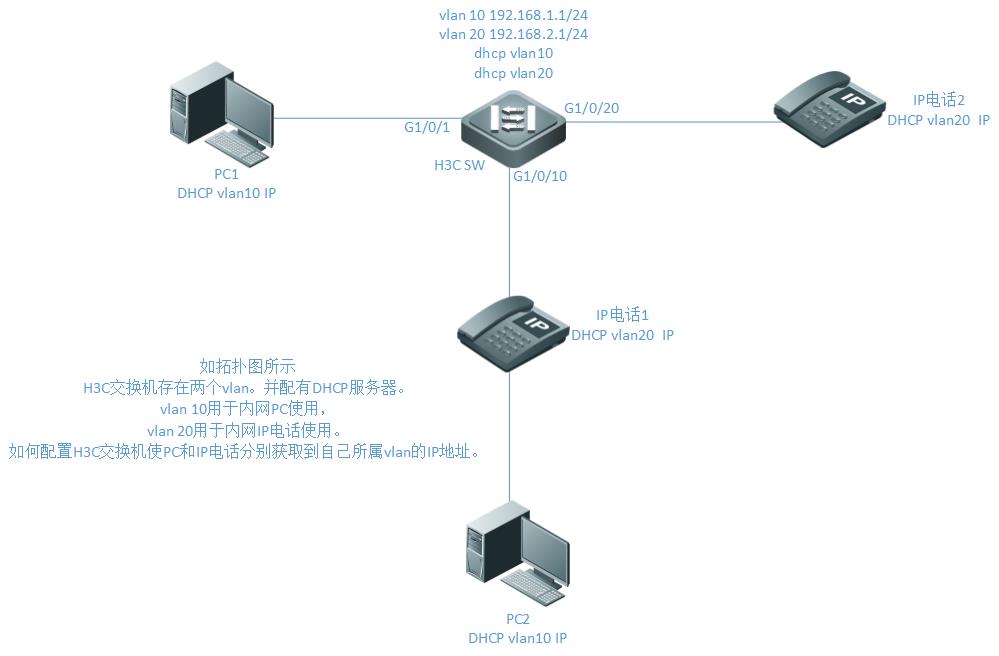 交换机怎么样才能配置到如图中所需要的那样。同一个端口可以使用IP电话或PC。它们分别获取到自己指定的vlan的IP地址。