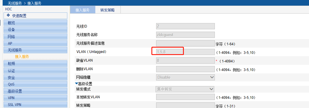 先关闭接入服务再修改。相当于修改命令行的interface ess接口下的vlan,因为这个接口已经绑定到某个服务模板下并且使能服务模板了,所以修改不生效