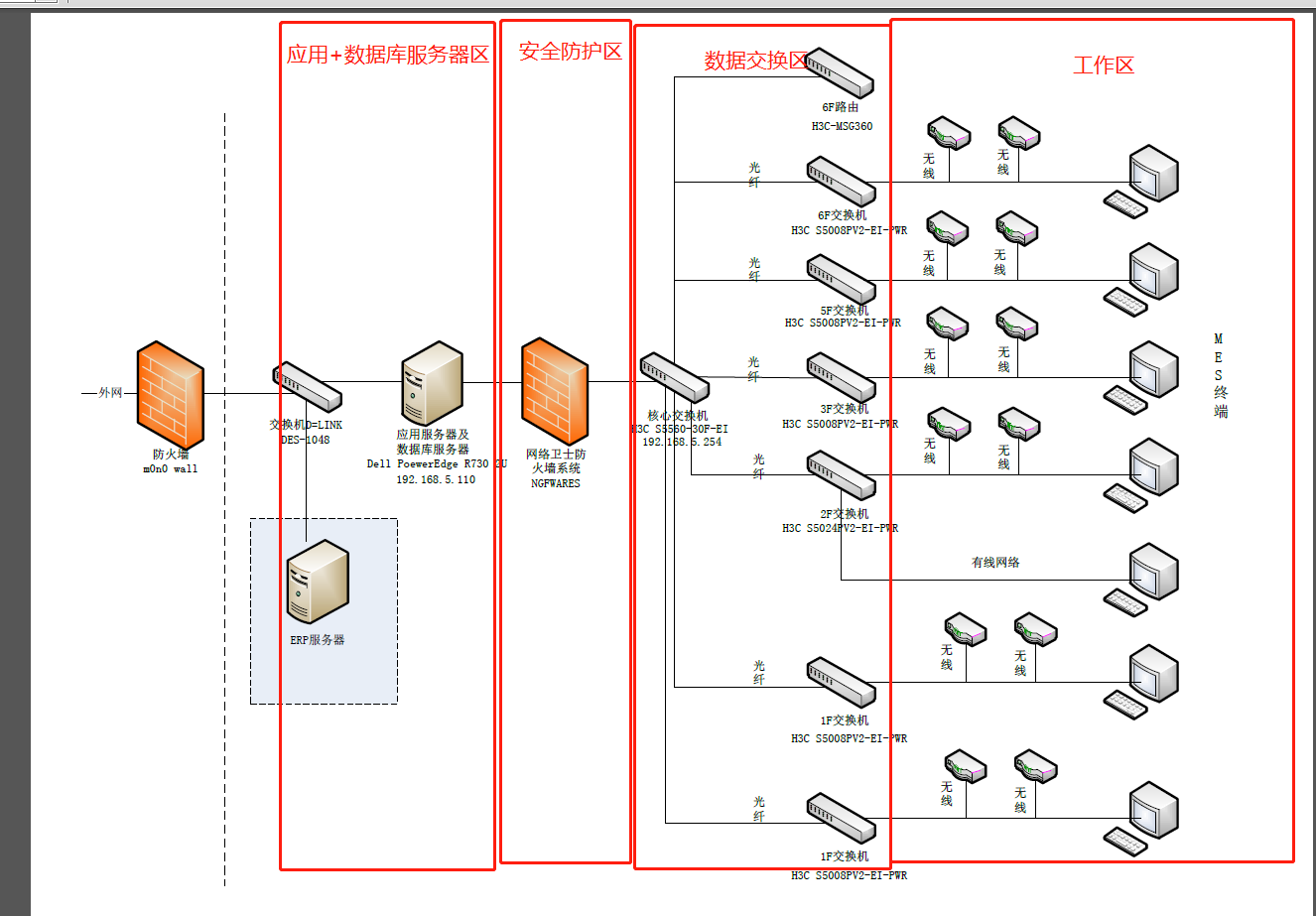 公司组网如下,核心交换机H3C S5560-30f-ei位于数据交换区,H3C小贝,是路由。