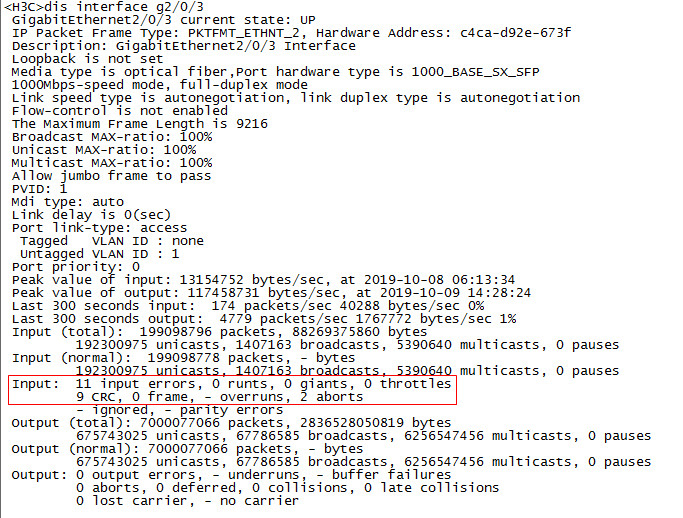 CRC错误计数,一般都是反映物理层传输错误,因此需要排查物理链路,替换网线后,清空端口计数,观察一段时间,如果还存在CRC可以替换端口测试。光口涉及到光模块的替换。