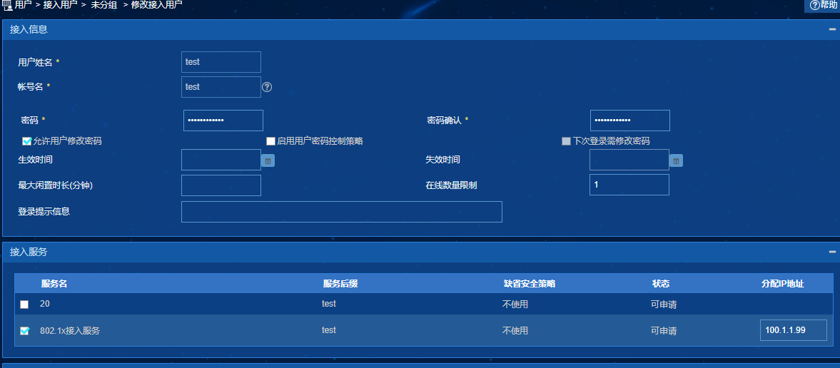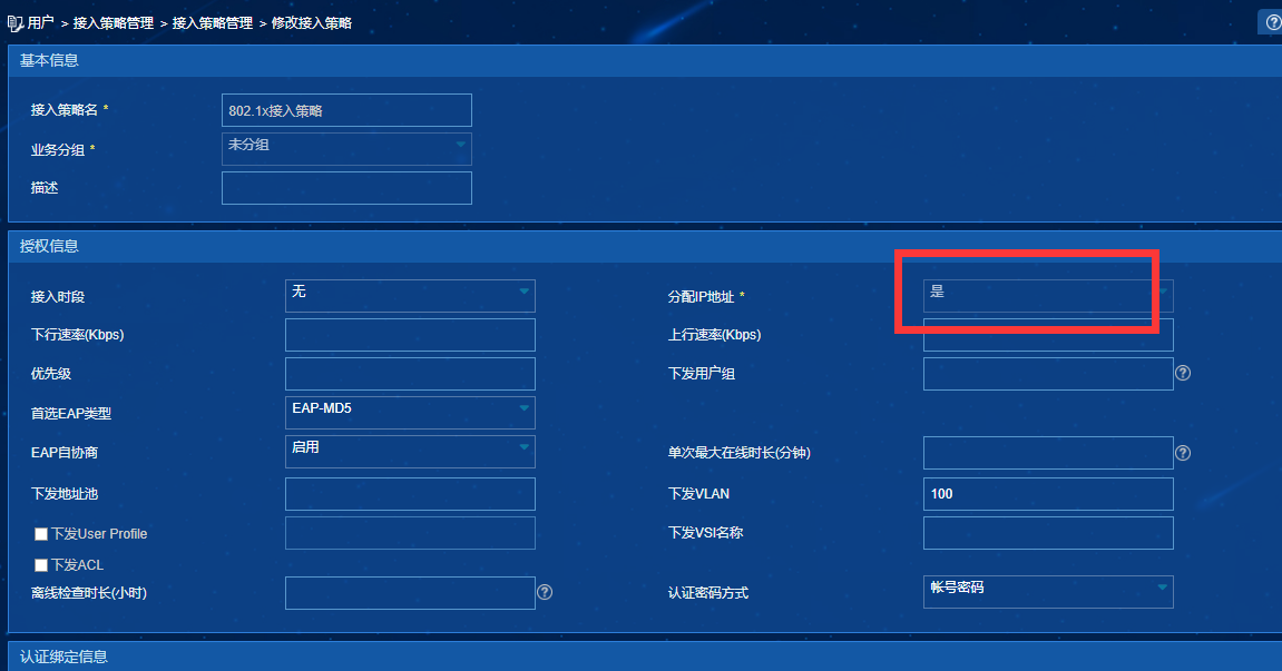如何用imc给802.1x认证成功的设备下发地址,我在接入策略里选择了下发地址,在创建接入用户的时候,在选择策略的时候也填上了下发的地址,但终端没有获取到地址