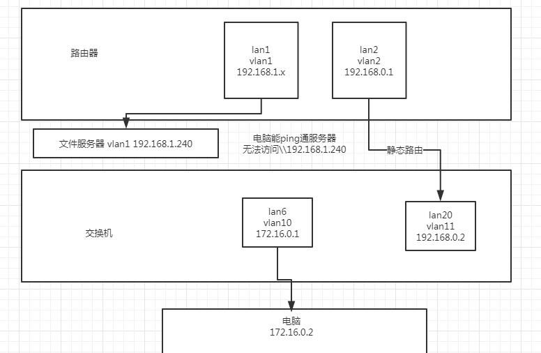 1.路由里面关闭防火墙测试过问题依旧,其他没有做过限制。2.我直接接在路由vlan2口用192.168.0.XX段测试问题依旧。所以排除交换机。3.服务器关闭防火墙或者新建规则针对445 139端口对任何IP地址开放后问题依旧。 4.路由器的vlan1下的电脑访问没有任何问题