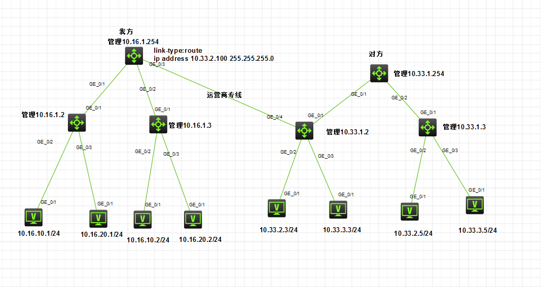 新手求助,目前两家单位内网需要通过运营商专线互联起来,互相访问。大致如下图,我方将运营商提供的线路直连到三层交换,改为route接口,并配了对方给的地址。现在三层交换上能够访问对面的10.33.2.0/24网段,但是下面交换机或者PC无法访问该网段,还需要如何配置。还有如何让对方能够访问我方其他网络资源。望指教!!!