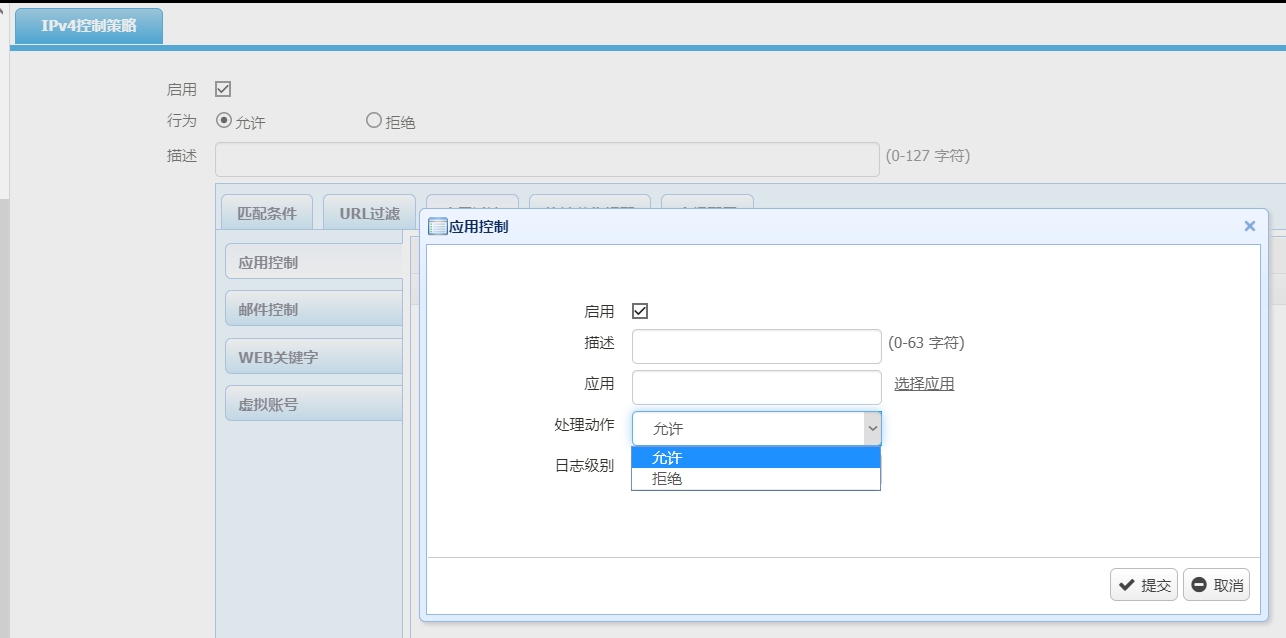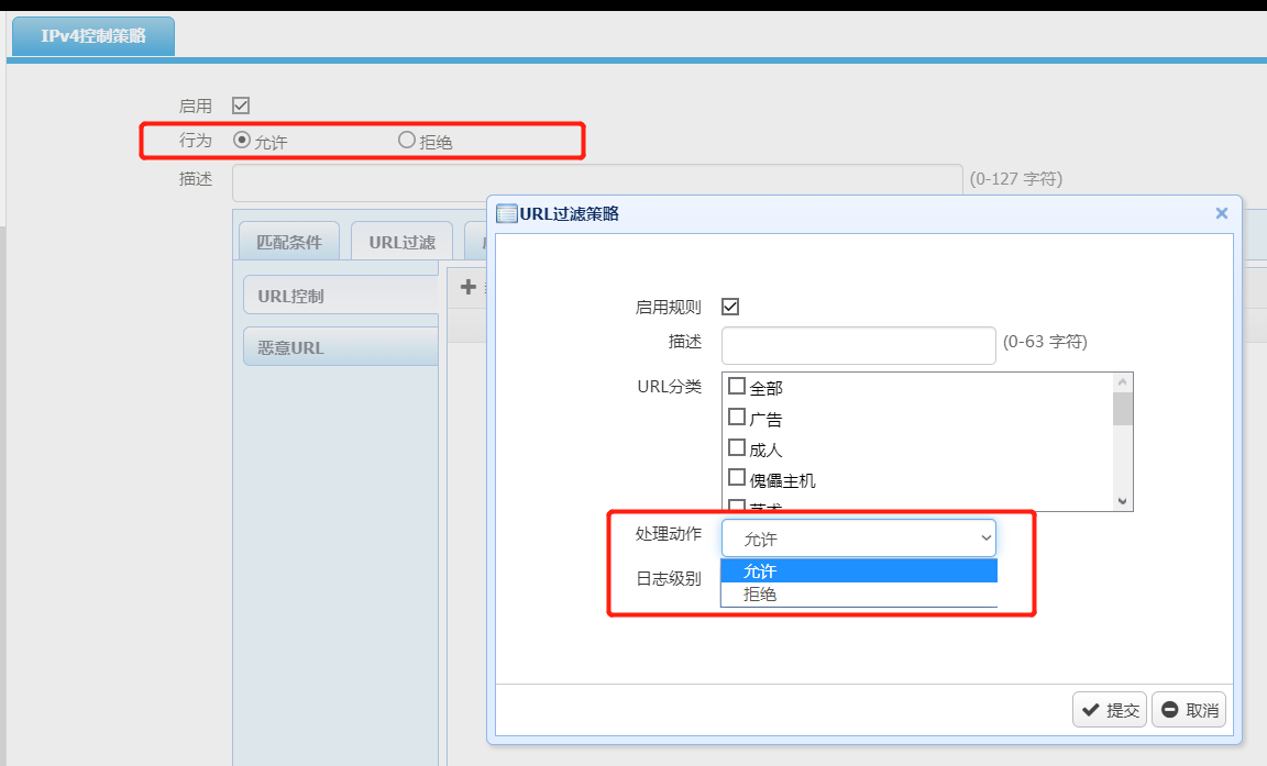ipv4控制策略这里 行为 有两个选项:允许和拒绝,