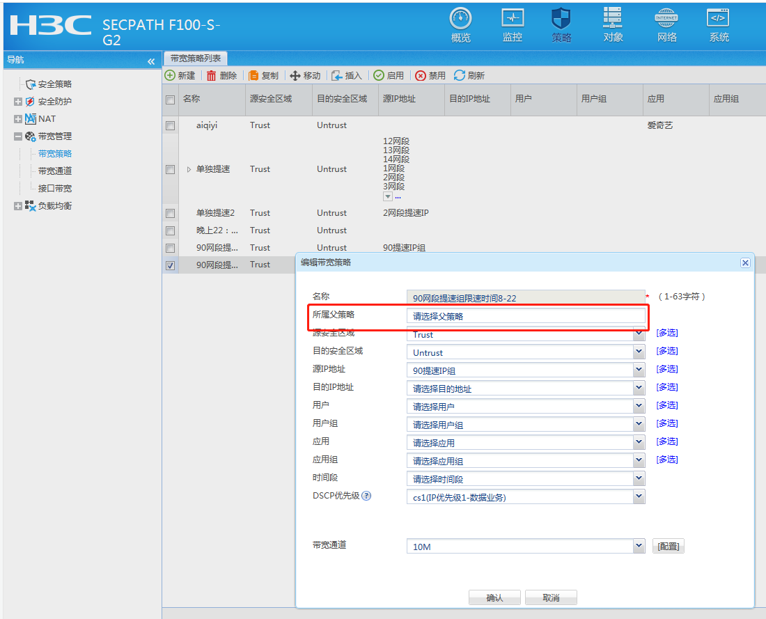 请问父策略 和 子策略的 通道带宽不一样,以哪个为准?