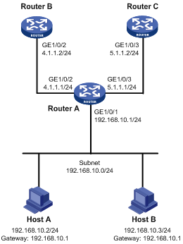 配置前请确保Router B和Host A/Host B,Router C和Host A/Host B之间路由可达。