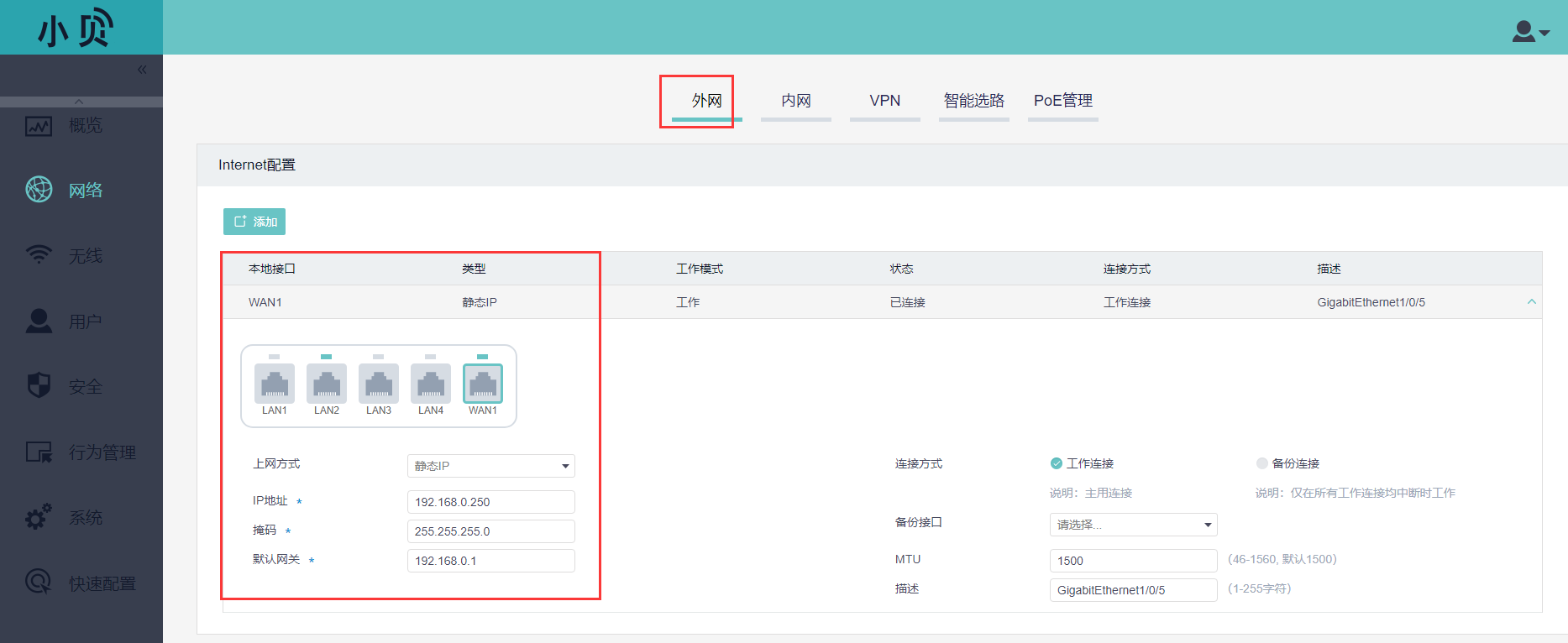 路由器3100G2 Lan口出来接交换机,MSG360 Wan接交换机,MSG360里面组网设置为网关模式,Wan口获取到上层路由器IP地址192.168.0.250,