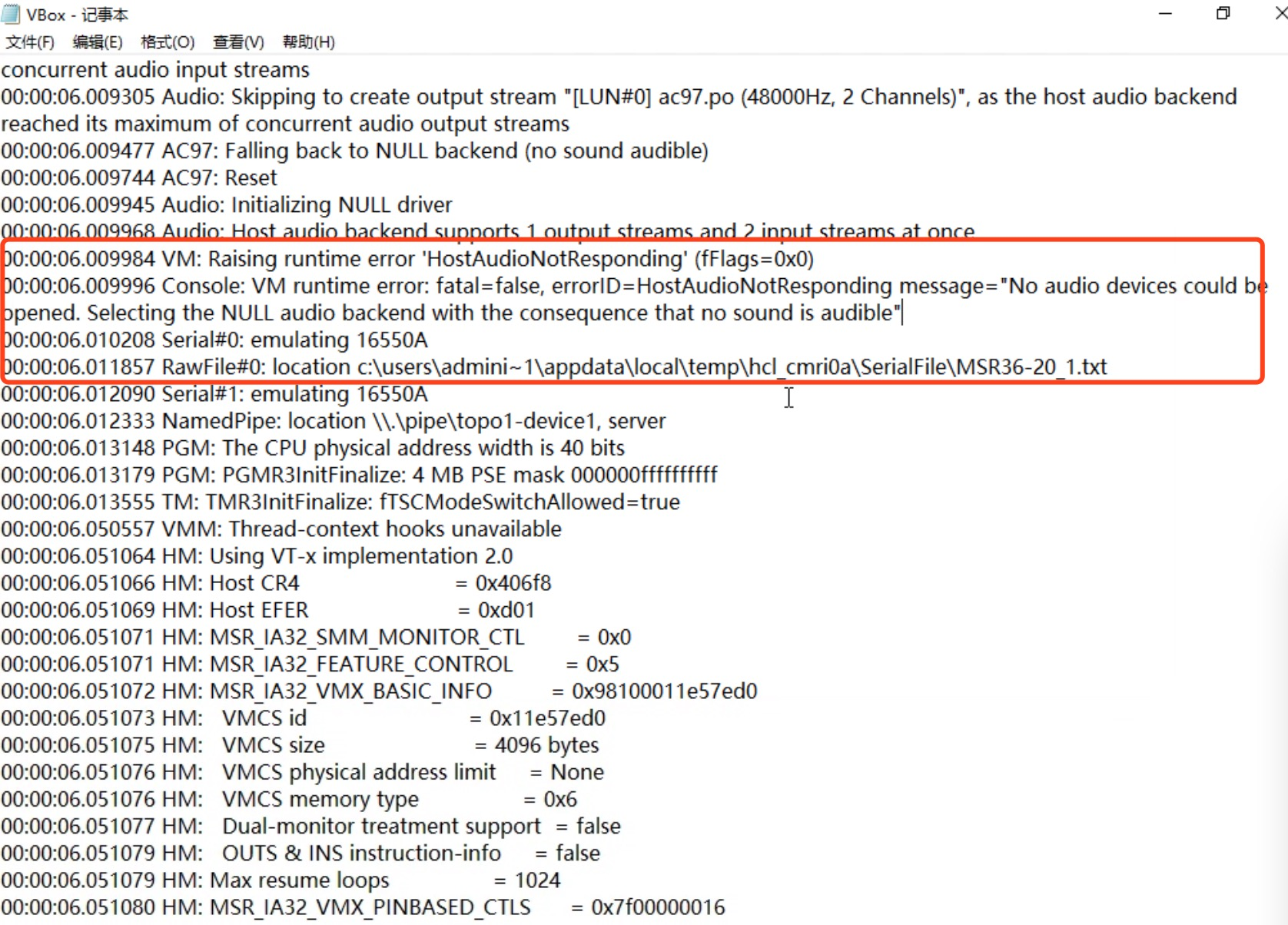 你好,我在云平台虚拟机里面跑的windows10专业版,然后想在里面安装HCL做实验,virtualbox用的5.1.30,但启动设备时出错,在HCL VMs\topo1\device1\Logs\VBox.txt日志文件发现如下错误,请问如何解决?(另外,不用虚拟机,在宿主机的windows10上能正常运行模拟器设备).
